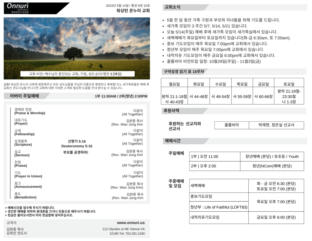 [워싱턴온누리교회] 2023년 5월 7일 주일예배 I 듣고 삼가 지키라! (신명기 6:1-7) I 김완중 목사
