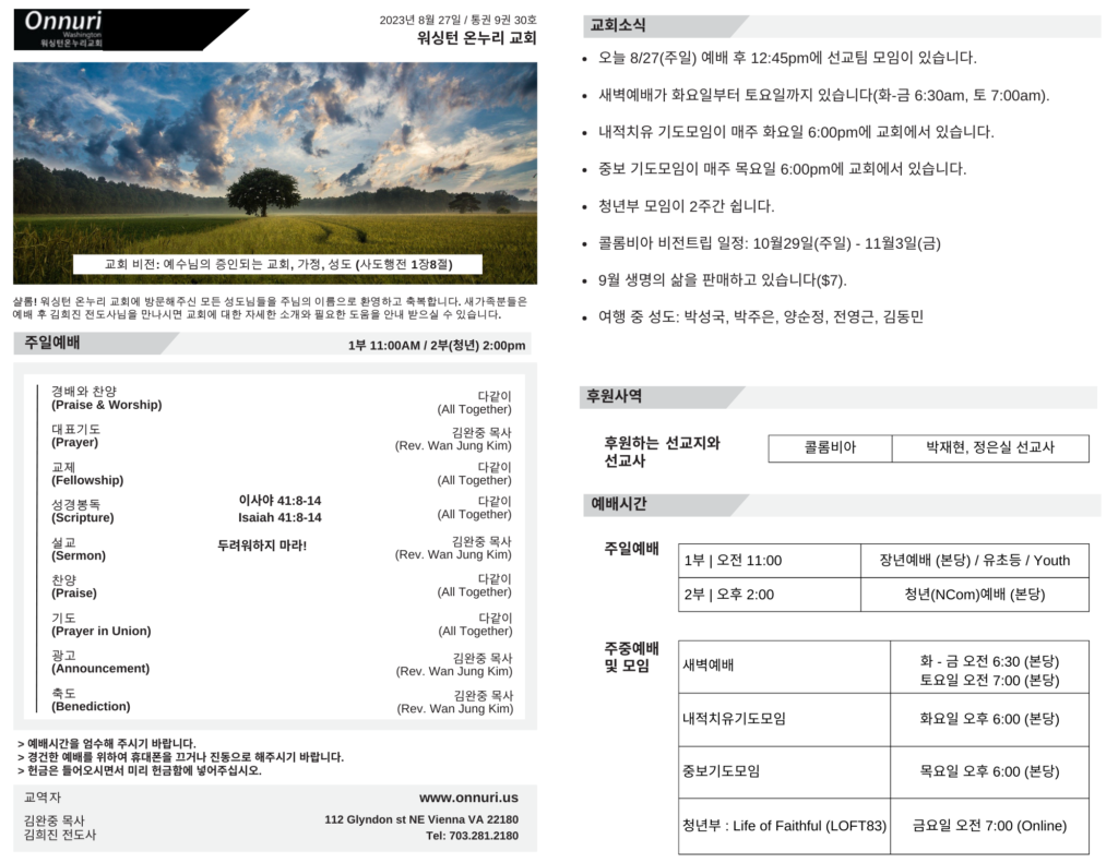 [워싱턴온누리교회] 2023년 8월 27일 주일예배 | 두려워하지 마라! (이사야 41:8-14) 김완중 목사