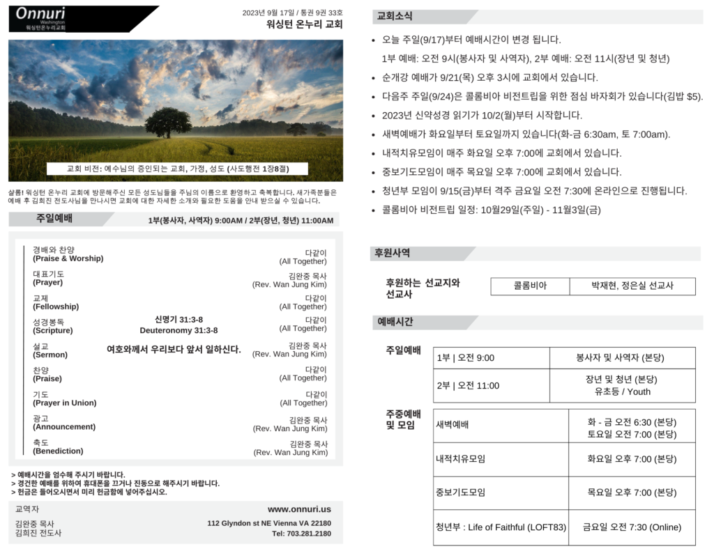 • [워싱턴온누리교회] 2023년 9월 17일 주일예배 | 여호와께서 우리보가 앞서 일하신다 (신명기 31:3-8) 김완중 목사 →