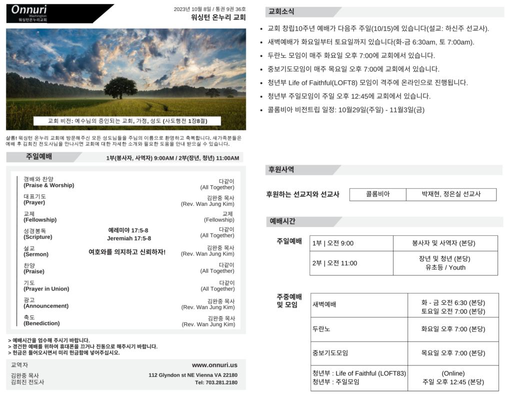 • ← [워싱턴온누리교회] 2023년 10월 08일 주일예배 | 여호와를 의지하고 신뢰하자 (예레미아 17:5-8) 김완중 목사