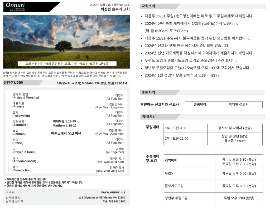 [워싱턴온누리교회] 2023년 12월 24일 성탄 축하예배 | 에수님께서 오신이유 (마태복음 1:18-25) 김완중 목사