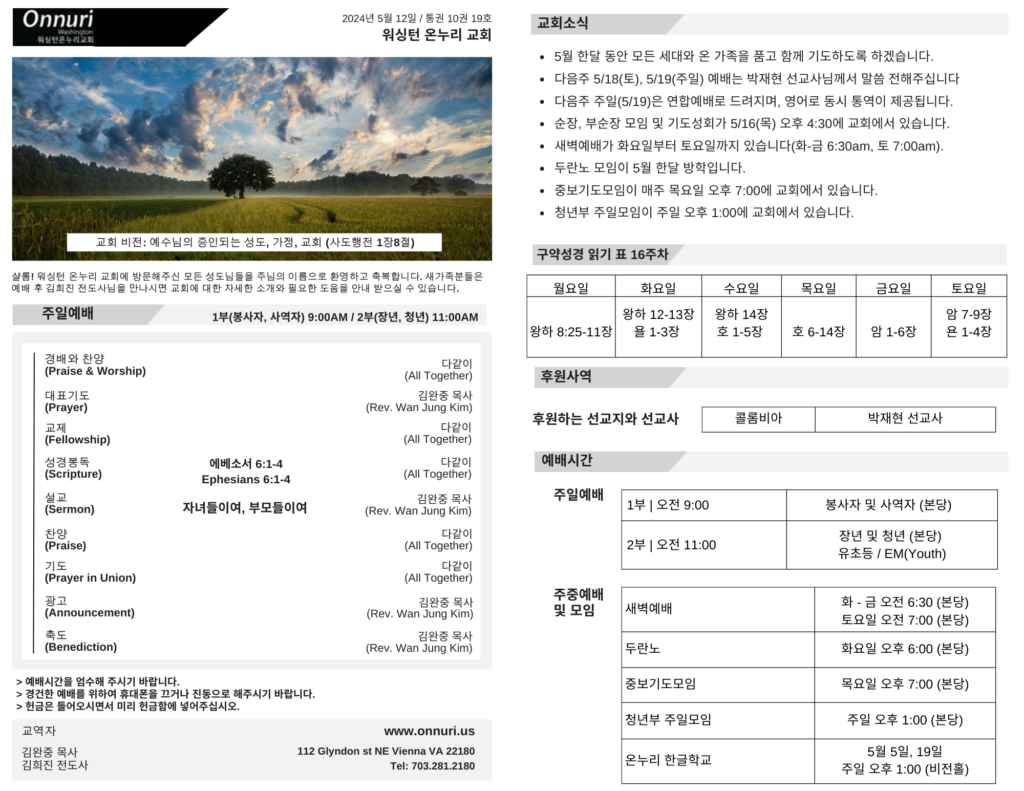 [워싱턴온누리교회] 2024년 5월 12일 주일예배 | 자녀들이여, 부모들이여(에베소서 6:1-4) 김완중 목사