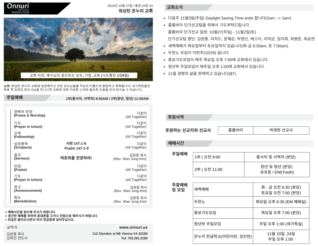 [워싱턴온누리교회] 2024년 10월 27일 주일예배 | 여호와를 찬양하라! (시편 147:1-9) 김완중 목사