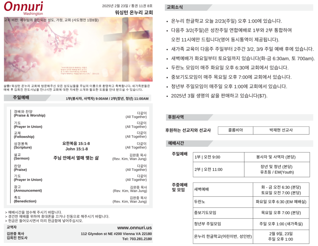 [워싱턴온누리교회] 2025년 2월 23일 주일예배 | 주님 안에서 열매 맺는 삶 (요한복음 15:1-8) 김완중 목사