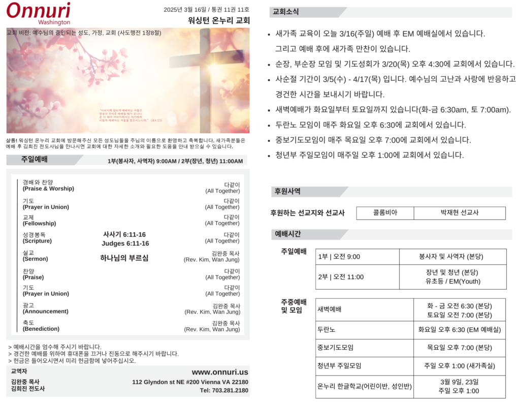 [워싱턴온누리교회] 2025년 3월 16일 주일예배 | 하나님의 부르심 (사사기 6:11-16) 김완중 목사