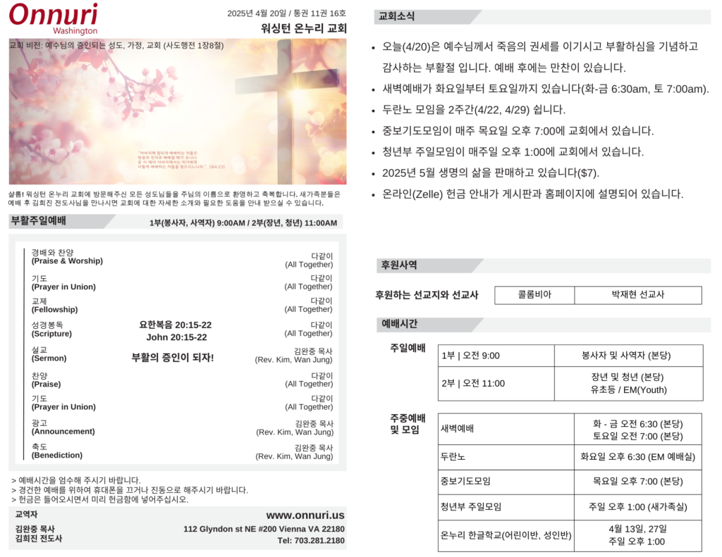 [워싱턴온누리교회] 2025년 4월 20일 부활주일 특별예배 | 부활의 증인이 되자! (요한복음 20:15-22) 김완중 목사