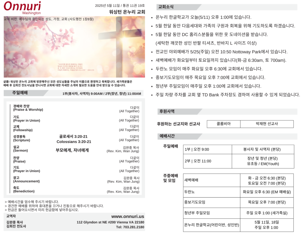 [워싱턴온누리교회] 2025년 5월 11일 주일예배 | 부모에게, 자녀에게 (골로새서 3:20-21) 김완중 목사