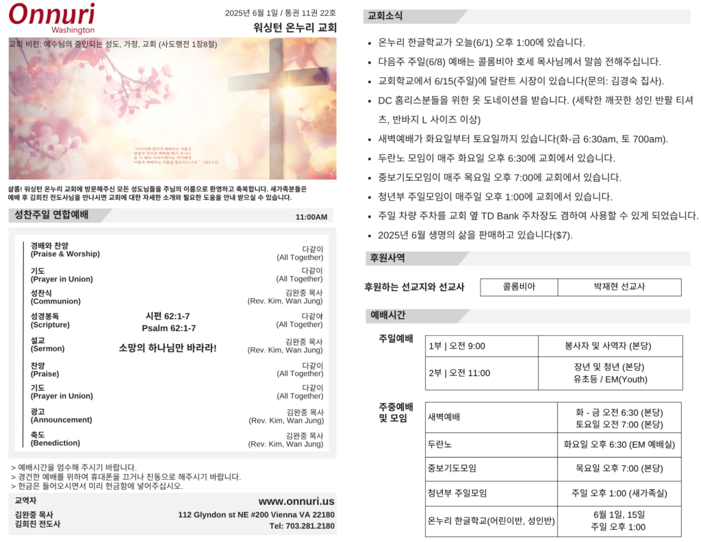 [워싱턴온누리교회] 2025년 6월 1일 주일예배 | 소망의 하나님만 바라라! (시편 62:1-7) 김완중 목사