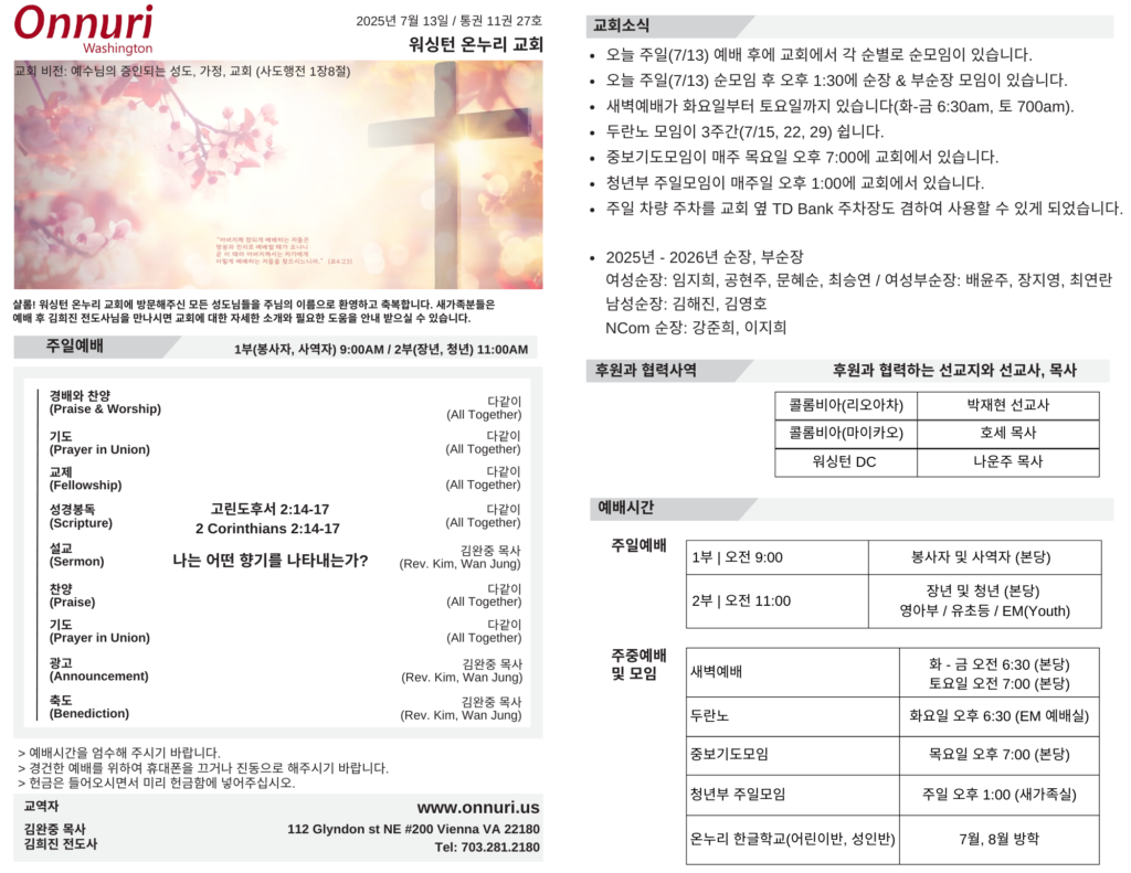 [워싱턴온누리교회] 2025년 7월 13일 주일예배 | 나는 어떤 향기를 나타내는가? (고린도후서 2:14-17) 김완중 목사