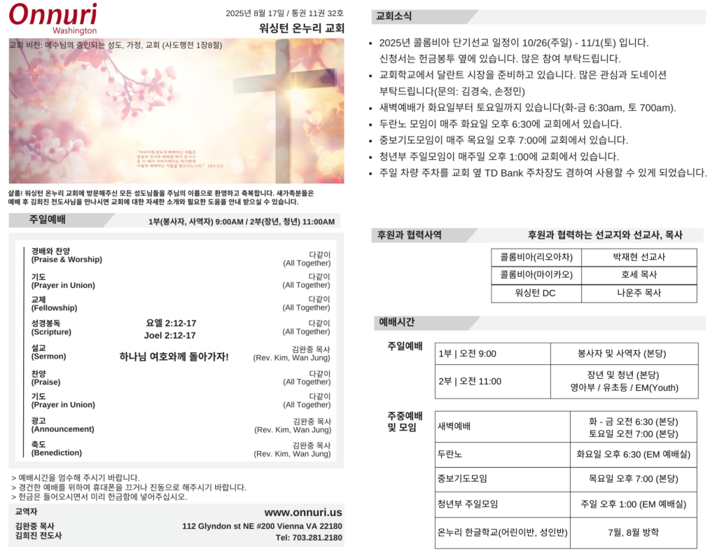 • [워싱턴온누리교회] 2025년 8월 17일 주일예배 | 하나님 여호와께 돌아가자! (요엘 2:12-17) 김완중 목사 →