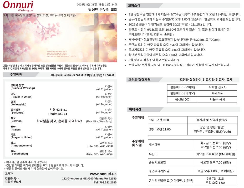 [워싱턴온누리교회] 2025년 8월 31일 주일예배 | 하나님을 찾고, 은혜를 기억하자! (시편 42:1-11) 김완중 목사