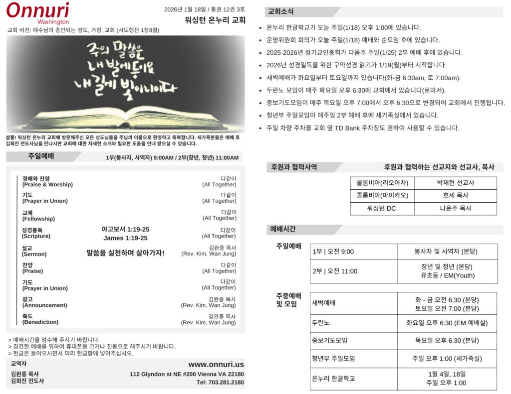 [워싱턴온누리교회] 2026년 1월 18일 주일예배 | 말씀 실천하며 살아가자! (야고보서 1:19-25) 김완중 목사